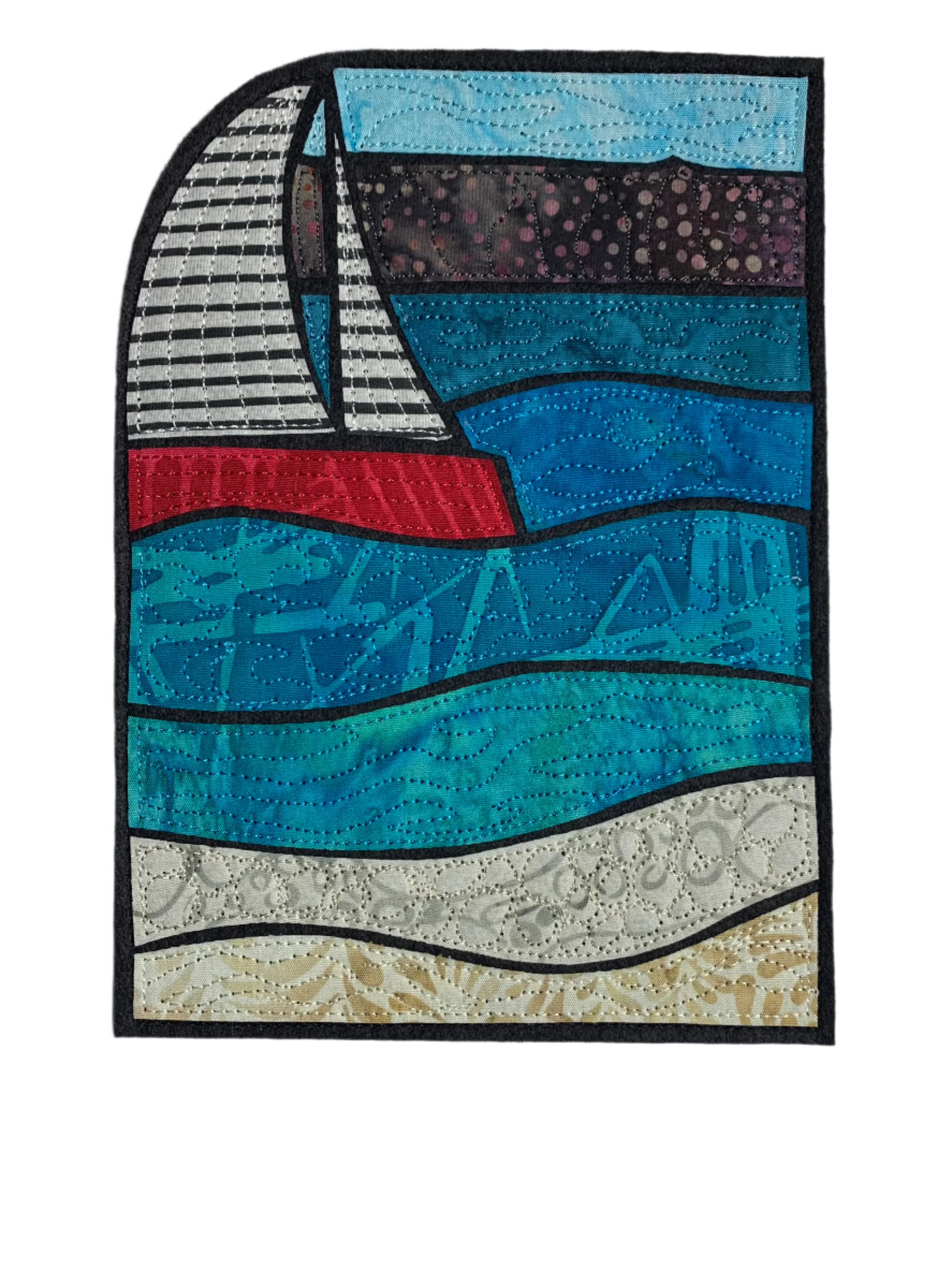 Send the perfect personalized postcard of your trip to Bear Lake (or whatever your favorite lake memory is) or keep it for yourself as a souvenir. Raw edge applique on black felt creates a unique and stunning stained glass effect that really shows off this beautiful lake scene.